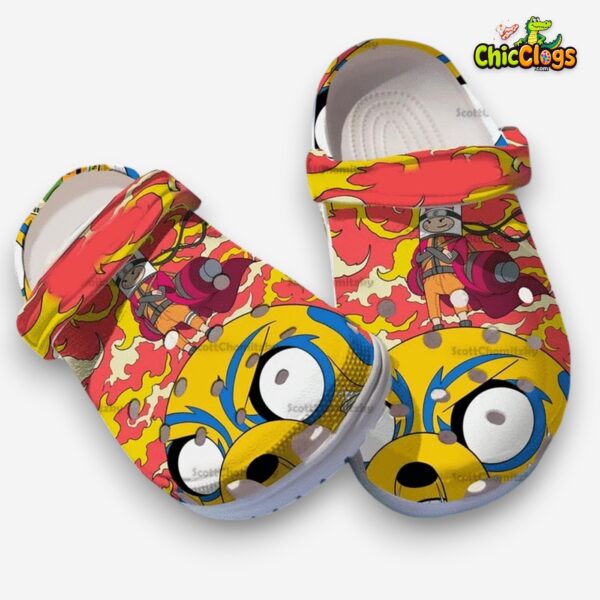 Step into a world of adventure with these vibrant clogs featuring iconic characters in a burst of lively colors. The bold, cartoon-inspired design captures the playful essence of your favorite animated series, making every step a fun journey. Perfect for fans and trendsetters alike, these shoes add a splash of personality to any outfit. Let your footwear do the talking and express your unique style effortlessly.